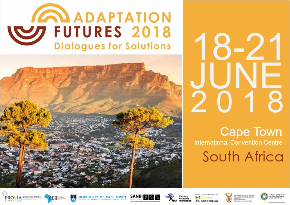 Adaptation Futures 2018 Adaptation Futures 2018, the fifth in the Adaptation Futures international conference series on global adaptation, was held in Cape Town from 18 -21 June. The conference aimed to facilitate Dialogues for Solutions between key actors from diverse perspectives and regions and attracted over 1300 scientists, practitioners, business leaders and policymakers from around the world. This is the first time the conference was held on the African continent. We used this setting to foreground developing country adaptation issues and increase developing world participation. Funding was raised to support the access of over 180 sponsored delegates from lower income countries and/or Africa.